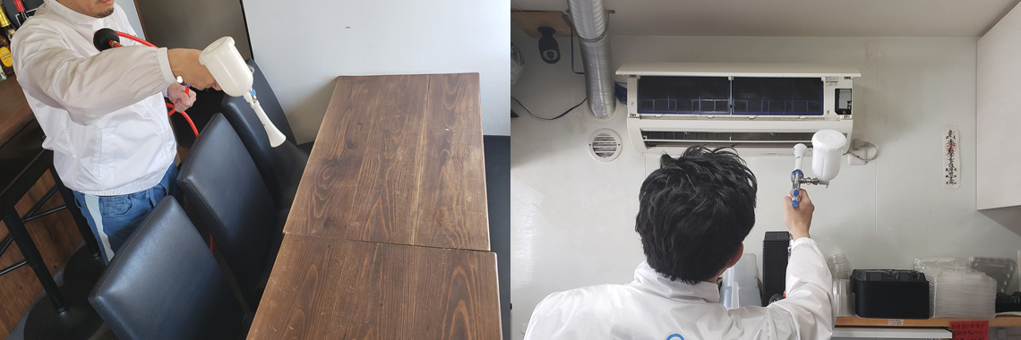 カフェの経営者ですが、新型ウイルス騒動で、お客様から飲食店に対する不安の声があったので、いろいろ調べて店内をナノゾーンコートしてもらいました。散布にあたっては特に何も下準備も要らず、室内をくまなくスプレーするだけで、乾くのも数時間でとても楽でした。はじめは半信半疑だったのですが、なんだかすぐに「厨房の匂いが気にならない?!」と感じ、効果を実感。これなら、どんな布や木などのインテリアも関係なくできて、手入れがいらなくて楽そうです♪他の部屋も頼もうかと思っています。